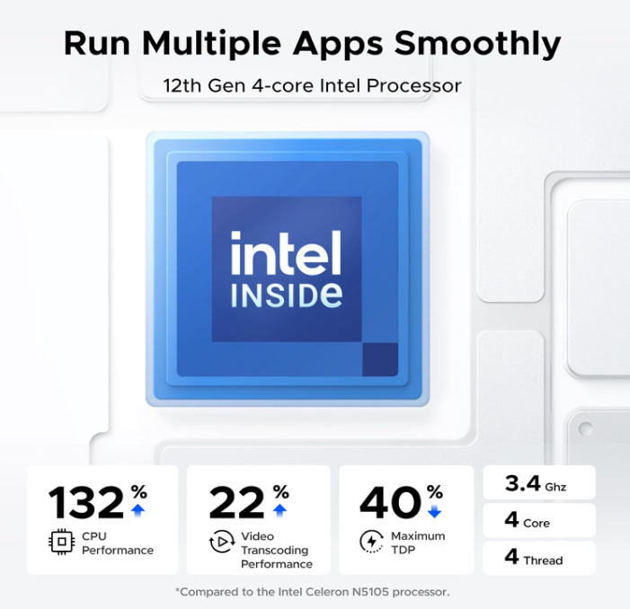 The DXP4800 4-Bay is equipped with an Intel Core i3-1315U processor based on the “Raptor Lake-U” architecture, featuring a hybrid design with 2 Performance-cores + 4 Efficient-cores + 64 Execution Units. This is a smart configuration choice—it ensures solid multi-tasking capability while effectively managing power consumption and cost.